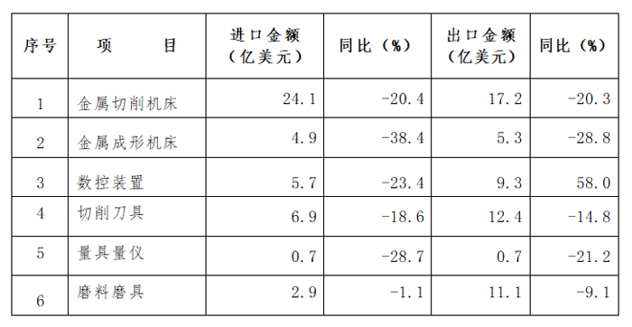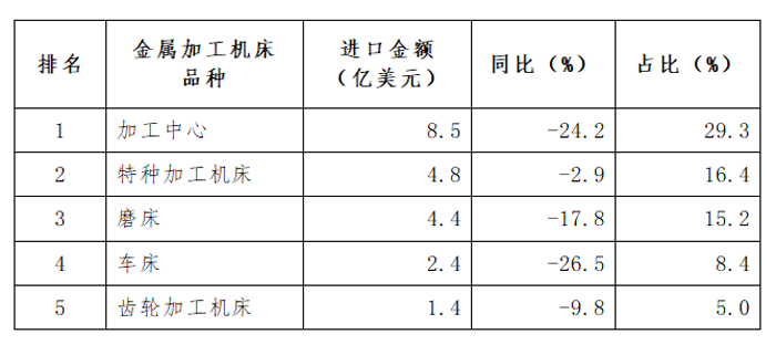 金屬加工機(jī)床進(jìn)口額29.0億美元,同比下降24.1%,降幅較一季度(-32.3%)收窄7.1個百分點(diǎn)。其中,金屬切削機(jī)床進(jìn)口額24.1億美元,同比下降20.4%,降幅較一季度(-27.4%)收窄7個百分點(diǎn);金屬成形機(jī)床進(jìn)口額4.9億美元,同比下降38.4%,降幅較一季度(-48.5%)收窄10.1個百分點(diǎn)。