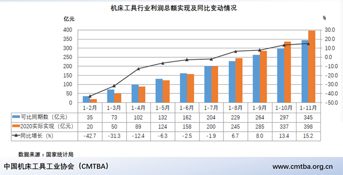 從近兩年機(jī)床工具行業(yè)利潤(rùn)總額同比增速圖可見(jiàn),2019年各月利潤(rùn)總額累計(jì)同比均為降低,2020年7月之前各月累計(jì)實(shí)現(xiàn)利潤(rùn)總額仍同比降低,但降幅逐月明顯收窄,8月之后則已變?yōu)橥仍鲩L(zhǎng),11月累計(jì)實(shí)現(xiàn)利潤(rùn)總額為同比增長(zhǎng)已高達(dá)15.2%。