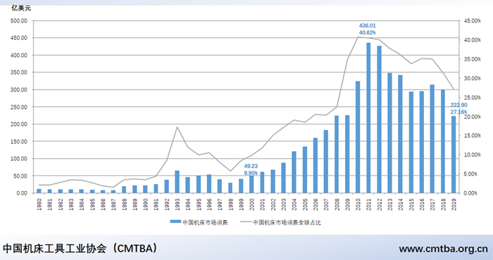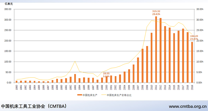 從1980-2019年中國(guó)機(jī)床市場(chǎng)消費(fèi)和在全球占比情況,可以看出中國(guó)機(jī)床工具行業(yè)近40年的發(fā)展歷程。2000年之前,機(jī)床需求一直處于小幅波動(dòng),這與中國(guó)經(jīng)濟(jì)的規(guī)模密切相關(guān)。2001年,中國(guó)加入WTO,開(kāi)始參與全球產(chǎn)業(yè)再分工,機(jī)床市場(chǎng)需求也由此開(kāi)始一路高升,并于2011年達(dá)到最高點(diǎn),這也是中國(guó)機(jī)床工具行業(yè)的黃金10年。從圖也可以看出,中國(guó)市場(chǎng)的機(jī)床工具消費(fèi)需求占世界機(jī)床市場(chǎng)的很大一部分,中國(guó)市場(chǎng)仍然是全球第一大市場(chǎng)。