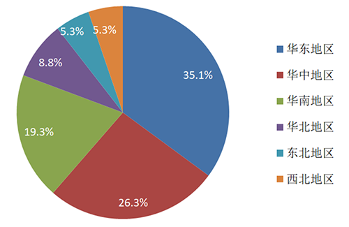 57家重點監測的上市公司中,華東地區20家,占35.1%,居于首位;華中地區15家,占26.3%,位居第二;華南地區11家,占19.3%,處于第三位;華北地區5家,占8.8%;東北地區和西北地區均為3家,各占5.3%。具體分布情況如圖1所示。