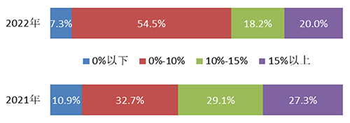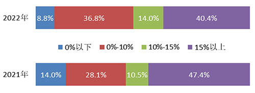 從利潤率的分布看,2022年度利潤率在0%以下的企業占8.8%,占比下降5.3個百分點;位于0%-10%之間的企業占36.8%,占比上升8.8個百分點;位于10%-15%之間的企業占14.0%,占比上升3.5個百分點;位于15%以上的企業占40.4%,占比下降7.0個百分點。整體分布明顯往中間兩個區域集中。利潤率的整體分布情況見圖4。