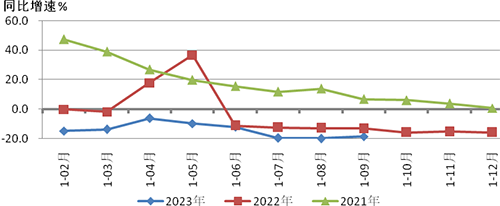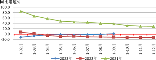 圖1是2023年1-9月和2022年、2021年重點(diǎn)聯(lián)系企業(yè)營(yíng)業(yè)收入同比增速情況的對(duì)比。