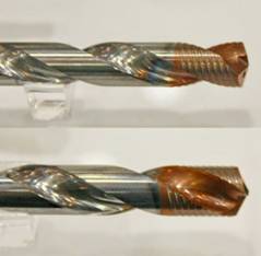 株洲鉆石推出了新的整體硬質合金麻花鉆系列GD鉆頭(圖6),替代原來的SU鉆頭。GD鉆頭優化了鉆尖結構,并采用了雙刃帶結構。減少了刃口崩缺或者斷刀,提高了加工的穩定性,保證了刀具整體的切削性能以適應多變的客戶工況。其良好的孔加工質量及精度在較差的工況下也能表現良好的切削性能。其光滑的涂層表面,能夠顯著減少切削阻力并且具有更加優異的耐磨性能。其金黃色涂層使其得到了明顯的磨損識別效果。作為通用加工鉆頭系列,可應用于各個行業、多種材料的加工。株洲鉆石的試驗結果表明,新的GD鉆頭比原來的整體硬質合金鉆頭使用壽命增加了1倍。