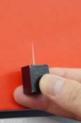 E2-291展臺,帝馬數字機器(深圳)的VBZ640立加,這臺BT40主軸的機床,正以4000r/min轉速,把一塊15mm×15mm的鋼件,銑削成一根Φ0.7mm×25mm長的一根針。