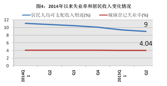 圖4是去年以來(lái),中國(guó)的就業(yè)和居民收入情況。由圖可見(jiàn),盡管今年上半年經(jīng)濟(jì)進(jìn)一步放緩,但是就業(yè)情況仍然保持穩(wěn)定。今年上半年實(shí)際新增就業(yè)718萬(wàn)人,完成全年目標(biāo)的72%。由圖還可以看出,盡管居民人均可支配收入的增速呈下降趨勢(shì),但是到今年二季度末,該數(shù)據(jù)仍然達(dá)到9%,繼續(xù)高于同期GDP增速(7%)。保證就業(yè)和居民收入增長(zhǎng)是發(fā)展經(jīng)濟(jì)的根本出發(fā)點(diǎn)和落腳點(diǎn),因此也是中國(guó)經(jīng)濟(jì)宏觀調(diào)控的底線之一,盡管GDP增速進(jìn)一步放緩,但就業(yè)和居民收入的良好表現(xiàn)為中國(guó)經(jīng)濟(jì)的全面改革和結(jié)構(gòu)調(diào)整提供了足夠的底氣。