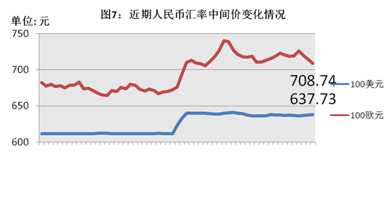 再說(shuō)匯市。8月11日,中國(guó)央行宣布改革人民幣兌美元匯率中間價(jià)報(bào)價(jià)機(jī)制,開(kāi)啟了我國(guó)新一輪匯率改革。期間,人民幣匯率曾面臨較大貶值壓力,但已逐步趨于穩(wěn)定。9月17日,國(guó)家外匯局宣布人民幣貶值壓力已經(jīng)基本釋放完畢,這標(biāo)志著新匯改已經(jīng)告一段落。圖7是今年三季度人民幣兌美元匯率中間價(jià)的變化情況,其中也顯示了人民幣兌歐元匯率的變化情況。