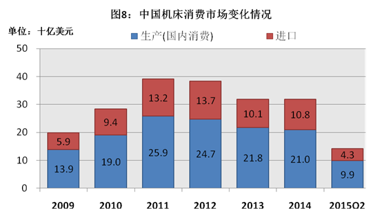 關(guān)于中國(guó)機(jī)床消費(fèi)市場(chǎng)變化的基本特征,我們還想做如下幾點(diǎn)說(shuō)明:首先,由于市場(chǎng)需求下降表現(xiàn)最為顯著的是低檔同質(zhì)化產(chǎn)品,而這些產(chǎn)品多為中國(guó)本土企業(yè)制造,因此,中國(guó)機(jī)床制造業(yè)受到的沖擊和影響更大一些。相對(duì)而言,進(jìn)口機(jī)床受到的影響較小一些,特別是由于市場(chǎng)需求結(jié)構(gòu)的升級(jí)特點(diǎn),進(jìn)口機(jī)床的比較優(yōu)勢(shì)在某種程度上還得到了相應(yīng)擴(kuò)大。其次,盡管中國(guó)機(jī)床消費(fèi)市場(chǎng)的需求總量呈下降趨勢(shì),但是中國(guó)仍然是全球最大的機(jī)床消費(fèi)國(guó),最大的機(jī)床進(jìn)口國(guó)和國(guó)際貿(mào)易的主要力量。2014年,中國(guó)機(jī)床消費(fèi)總額達(dá)到318億美元,占全球消費(fèi)總額的42.1%,機(jī)床進(jìn)口額達(dá)到108億美元,占全球的29.8%,機(jī)床貿(mào)易總量達(dá)到142億美元,占全球貿(mào)易總額的18.1%。最后,中國(guó)機(jī)床消費(fèi)市場(chǎng)需求總量的下降是階段性的,從某種意義上講,這是實(shí)施經(jīng)濟(jì)結(jié)構(gòu)調(diào)整所必需付出的合理代價(jià),隨著中國(guó)經(jīng)濟(jì)結(jié)構(gòu)調(diào)整的不斷深入,必將有效釋放中國(guó)機(jī)床消費(fèi)市場(chǎng)的長(zhǎng)期增長(zhǎng)潛力。盡管中國(guó)經(jīng)濟(jì)體量已經(jīng)很大,但是中國(guó)仍然是發(fā)展中國(guó)家,中國(guó)的新型工業(yè)化、信息化、城鎮(zhèn)化和農(nóng)業(yè)現(xiàn)代化還有很長(zhǎng)的路要走,這意味著中國(guó)機(jī)床消費(fèi)市場(chǎng)還有長(zhǎng)期的增長(zhǎng)潛力和巨大的增長(zhǎng)空間。