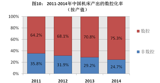受全球經(jīng)濟(jì)再平衡特別是中國(guó)經(jīng)濟(jì)結(jié)構(gòu)調(diào)整和增速放緩的影響,近年來(lái)中國(guó)機(jī)床消費(fèi)市場(chǎng)已經(jīng)發(fā)生了顯著變化,變化的基本特征表現(xiàn)在兩個(gè)方面,一方面是市場(chǎng)需求總量明顯減少,其中,低檔同質(zhì)化產(chǎn)品和重大型機(jī)床產(chǎn)品的需求下降尤為顯著。圖8反映了上述趨勢(shì)。另一方面則表現(xiàn)為市場(chǎng)需求結(jié)構(gòu)的快速升級(jí),升級(jí)的主要方向表現(xiàn)為自動(dòng)化成套、客戶(hù)化定制和普遍換擋升級(jí)(圖9)。其中,市場(chǎng)對(duì)自動(dòng)化成套設(shè)備的需求增長(zhǎng)尤為顯著,這除了源自于中國(guó)機(jī)床用戶(hù)領(lǐng)域的升級(jí)需求,還源自于中國(guó)勞動(dòng)力成本的快速提高和勞動(dòng)力供需關(guān)系的明顯變化。圖10反映的是近年來(lái)中國(guó)機(jī)床制造業(yè)產(chǎn)出數(shù)控化率的變化情況(以產(chǎn)值計(jì)),可以看出,在中國(guó)機(jī)床消費(fèi)市場(chǎng)需求總量明顯減少的4年中,中國(guó)機(jī)床制造業(yè)產(chǎn)出數(shù)控化率也在快速優(yōu)化,與2011年相比,2014年該數(shù)據(jù)提高了11.1個(gè)百分點(diǎn),這從一個(gè)側(cè)面反映了中國(guó)機(jī)床消費(fèi)市場(chǎng)普遍換檔升級(jí)的特征。