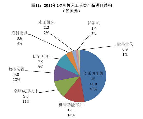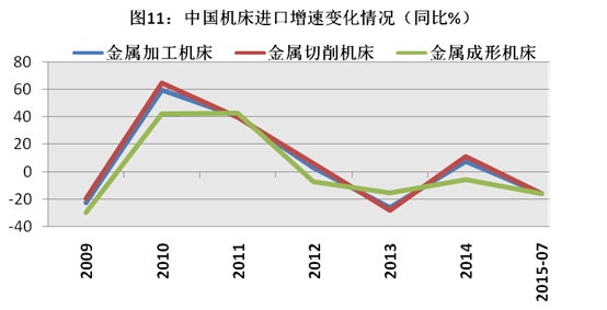 圖11是近年來(lái)中國(guó)金屬加工機(jī)床進(jìn)口增速的同比變化情況,可以看出,機(jī)床進(jìn)口增速在2010年達(dá)到59.8%的高點(diǎn),以后3年連續(xù)下滑,至2013年降為-26%,去年增速反彈至7.6%,今年1-7月又回到了負(fù)增長(zhǎng)狀態(tài)(-15.9%)。