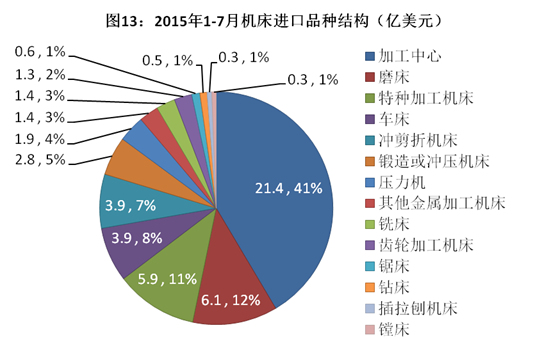 圖13是進(jìn)口機(jī)床按產(chǎn)品種類(lèi)分布的情況,數(shù)據(jù)顯示,進(jìn)口額較大的品種依次順序?yàn)榧庸ぶ行摹⒛ゴ病⑻胤N加工機(jī)床、車(chē)床和沖剪折機(jī)床,以上五類(lèi)機(jī)床進(jìn)口額為41.1億美元,占比79.7%。