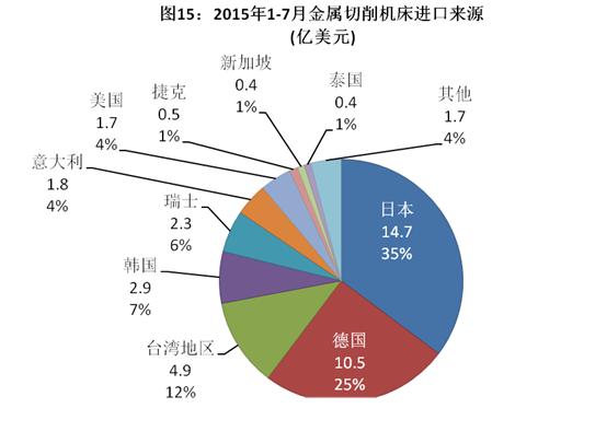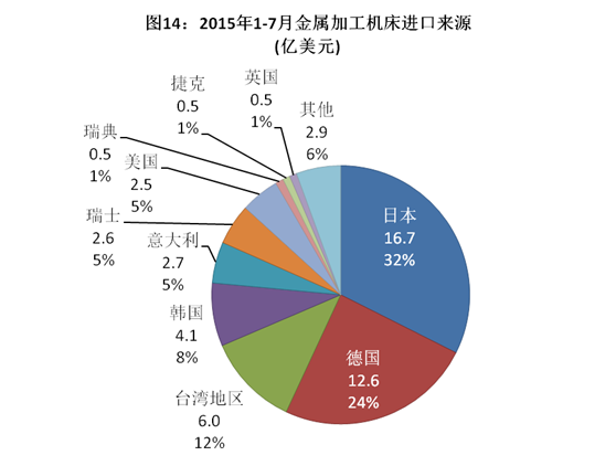 圖14是進(jìn)口機(jī)床按進(jìn)口來(lái)源分布的情況,數(shù)據(jù)顯示,進(jìn)口額較大的國(guó)家和地區(qū)依次順序?yàn)槿毡尽⒌聡?guó)、臺(tái)灣地區(qū)、韓國(guó)和意大利,以上來(lái)源的進(jìn)口總額達(dá)到42.1億美元,占比81.6%。