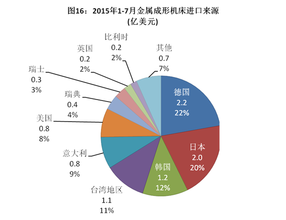 圖15是金屬切削機(jī)床按進(jìn)口來(lái)源分布的情況,數(shù)據(jù)顯示,進(jìn)口額較大的國(guó)家和地區(qū)依次順序?yàn)槿毡尽⒌聡?guó)、臺(tái)灣地區(qū)、韓國(guó)和瑞士,以上來(lái)源的進(jìn)口總額達(dá)到35.3億美元,占比84.4%。