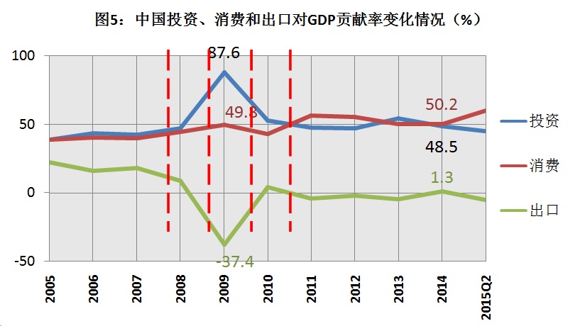 再請(qǐng)大家看另一組數(shù)據(jù)。圖5是10年來(lái)投資、消費(fèi)和出口對(duì)GDP增長(zhǎng)貢獻(xiàn)率的變化情況。可以看出,2008年以前,中國(guó)經(jīng)濟(jì)增長(zhǎng)表現(xiàn)為“三駕馬車(chē)”共同拉動(dòng),投資、消費(fèi)和出口對(duì)GDP增長(zhǎng)的貢獻(xiàn)率基本保持均衡水平;2009年,由于全球金融危機(jī)的影響和中國(guó)大規(guī)模刺激計(jì)劃的效果,經(jīng)濟(jì)增長(zhǎng)動(dòng)力表現(xiàn)為嚴(yán)重的結(jié)構(gòu)失衡狀態(tài),投資對(duì)經(jīng)濟(jì)增長(zhǎng)的貢獻(xiàn)率達(dá)到創(chuàng)紀(jì)錄的87.6%!而出口對(duì)經(jīng)濟(jì)增長(zhǎng)的貢獻(xiàn)率也達(dá)到創(chuàng)紀(jì)錄的-37.4%!從2010年開(kāi)始,由于全球市場(chǎng)需求大幅下降和中國(guó)出口競(jìng)爭(zhēng)力減弱等多重因素的影響,中國(guó)經(jīng)濟(jì)增長(zhǎng)事實(shí)上表現(xiàn)為投資和消費(fèi)“兩駕馬車(chē)”拉動(dòng)的模式。我們特別注意到,從2011年開(kāi)始,消費(fèi)已經(jīng)取代投資成為中國(guó)經(jīng)濟(jì)增長(zhǎng)的第一拉動(dòng)力。今年上半年,這一數(shù)字已經(jīng)達(dá)到60%!這是長(zhǎng)期以來(lái)不曾有過(guò)的情況,而這種情況正是中國(guó)經(jīng)濟(jì)結(jié)構(gòu)調(diào)整所追求的主要目標(biāo),即實(shí)現(xiàn)主要依靠消費(fèi)拉動(dòng)的經(jīng)濟(jì)增長(zhǎng)模式。