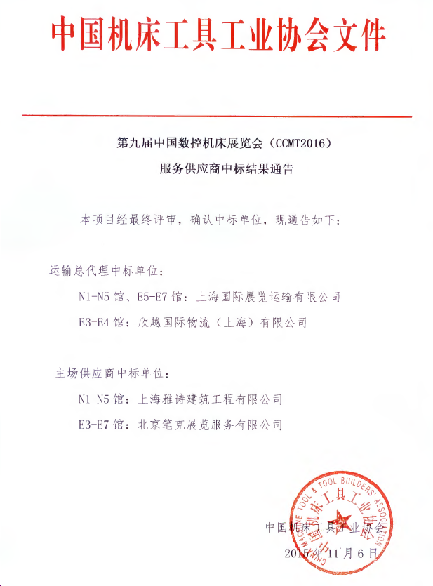 第九屆中國數控機床展覽會(CCMT2016)服務供應商中標結果通告