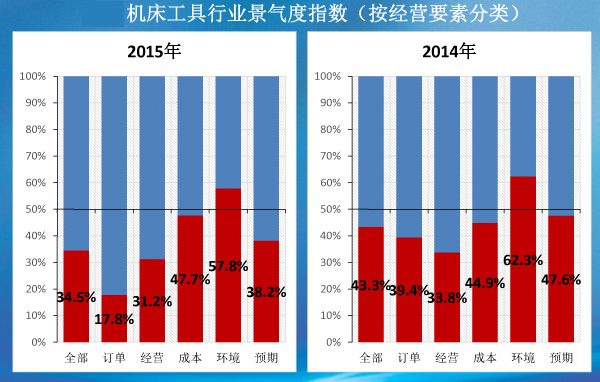 從分行業的景氣度情況看,2015年各分行業的景氣度指數均低于2014年。其中,金屬切削機床為36%,與2014年相比小幅下降3個百分點;金屬成形機床為33.3%,與2014年相比陡降30.4個百分點(降幅達47.7%);工量具為21.4%,與2014年相比陡降29.3個百分點(降幅達57.8%);功能部件和數控系統為31%,與2014年相比大幅下降15.8個百分點(降幅達33.8%)。景氣度指數下降幅度由大到小的排序分別是金屬成形機床、工量具、功能部件與數控系統和金屬切削機床。以上分行業指數和對比情況基本符合行業市場和經濟運行的實際趨勢。