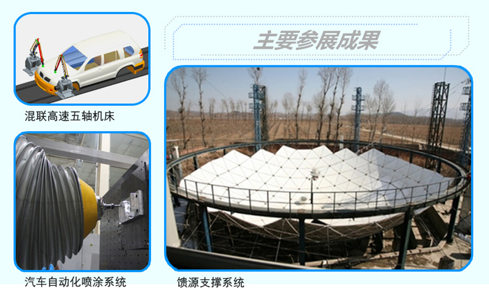 清華大學機械工業并混聯機構及控制重點實驗室高度重視此次展會提供的展示機會,通過展板、宣傳冊、影像視頻和實物等多種形式,充分展示實驗室的科研創新成果。主要展示內容涵蓋應用于航空結構件高效切削的混聯高速五軸加工中心、國家大科學工程——500米口徑大型射電望遠鏡饋源支撐系統、汽車自動化噴涂系統、與齊二機床合作研發的XNZ2430與XNZ2415龍門式五軸混聯重型機床、與北二機床合作研發的雙砂輪架隨動式數控曲軸磨床等。其中,基于并聯結構新型主軸頭的五軸聯動加工裝備(見圖1)有效克服了傳統串聯式主軸頭過象限加工時易銑傷零件、加工中無效路徑長、擺角速度與線速度不匹配等一系列問題,并打破了國外的技術壟斷和封鎖,在航空結構件的高效加工方面具有獨特優勢?;谛滦蛧娡繖C器人建立的汽車自動化噴涂系統,解決了傳統汽車涂裝生產線噴涂質量差、涂料利用率低、自動化程度低、耗能高、污染重的難題。通過對剛柔耦合特性和終端精度保證策略的深入研究,將柔性支撐并聯機構成果應用于巨型望遠鏡饋源支撐系統,極大降低了建造成本,為我國500米口徑大型球面射電望遠鏡的大科學工程建設做出了重要貢獻。