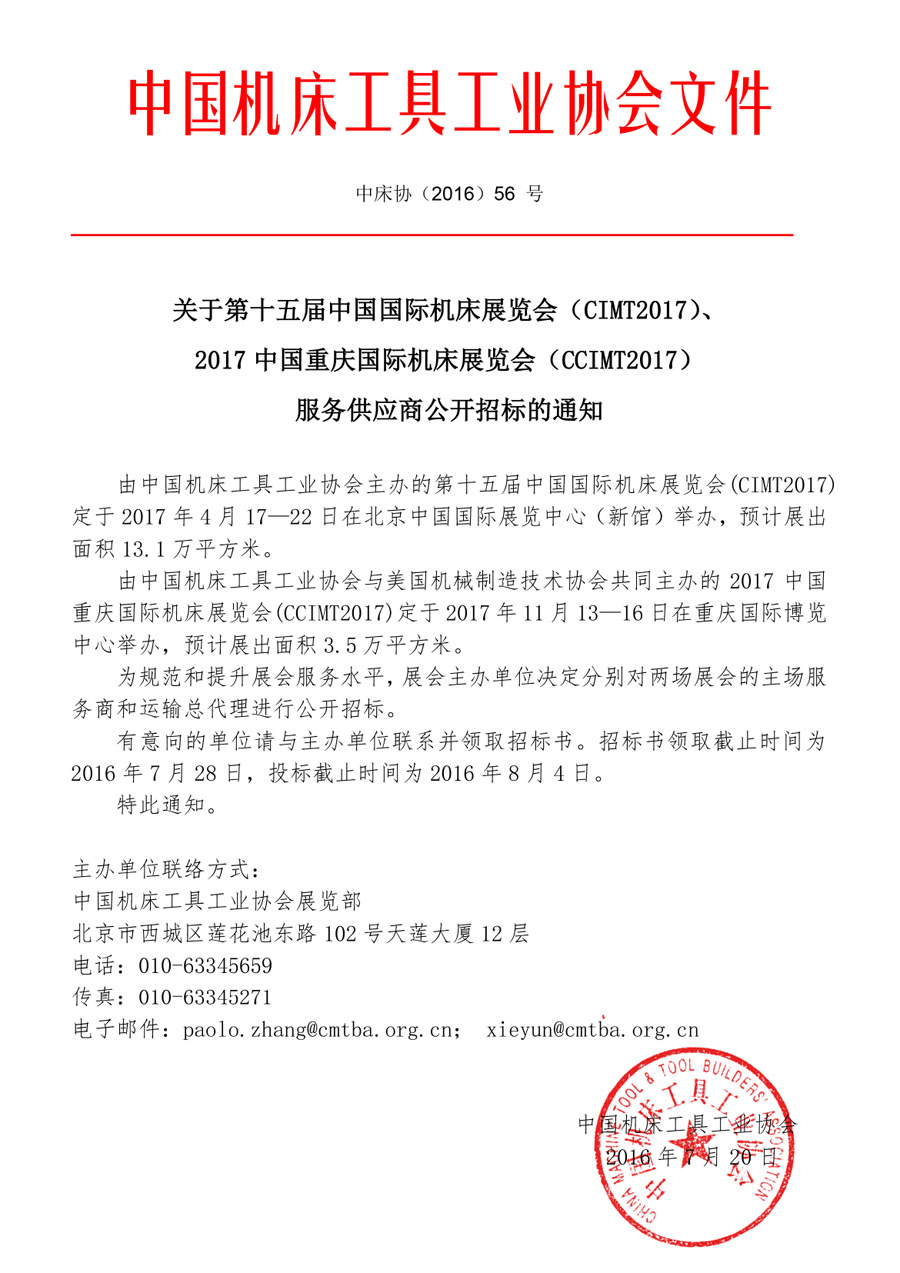 關于CIMT2017、CCIMT2017服務供應商公開招標的通知