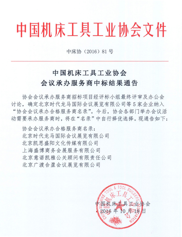 中國機床工具工業協會會議承辦服務商中標結果通告