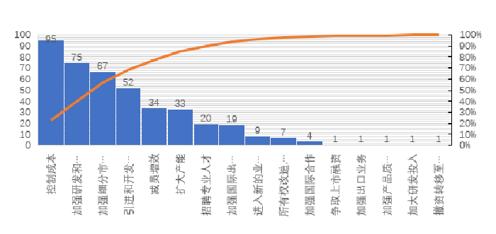 企業(yè)采取的主要措施有:控制成本(占22.6%),加強(qiáng)研發(fā)和技改投入(占17.9%),加強(qiáng)細(xì)分市場(chǎng)開(kāi)拓(占16.0%),引進(jìn)和開(kāi)發(fā)新產(chǎn)品(占12.4%),減員增效(占8.1%)和擴(kuò)大產(chǎn)能(占7.9%)。
