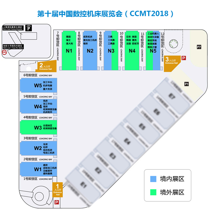 CCMT2018展會使用上海新國際博覽中心N1-N5,W1-W5共10個室內展館,其中境外展區使用N1、N4、W3館,境內展區使用N2、W1、W2、W4、W5館,N3和N5館為境內外混合布展。