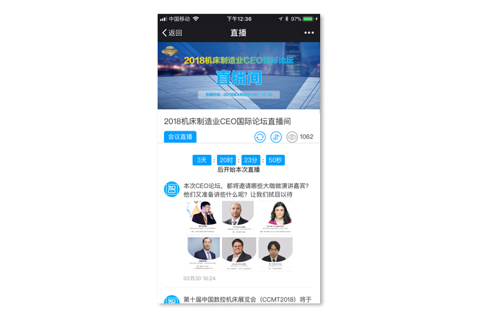 作為CCMT2018開幕重頭戲的“2018機床制造業CEO國際論壇”專題直播間今天正式上線了!