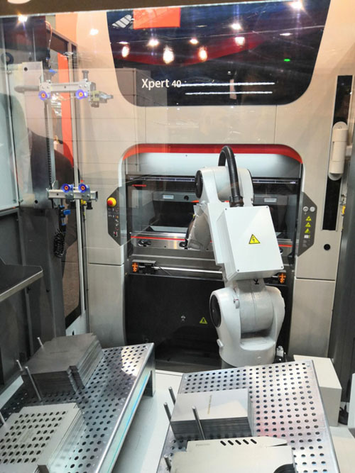(2)工業機器人得以廣泛應用。百超、LVD、MAZAK都展出了工業機器人的應用范例。如百超的可移動折彎單元(工業機器人+Xpert40)、折彎單元(Xpert Pro 150+工業機器人),LVD的DYNA CELL折彎單元(工業機器人+DYNA-Press 40/15 Pro),MAZAK展出的智能切割單元(Optiplex 3015 Fiber III+工業機器人)。