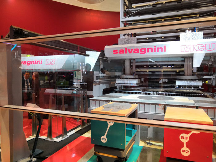 (4)柔性生產線。百超、薩瓦尼尼展出了他們的FMS。百超展出的生產線由ByStar Fiber 3015的激光切割機、ByTrans Cross3015模塊化自動上下料系統、BySort4.0自動分揀系統、Antil塔式存儲系統組成。薩瓦尼尼則展示了由沖剪復合中心S4Xe和多邊折彎中心P4組成的柔性生產線。