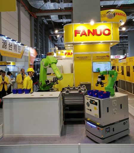 FANUC公司展示面積相對較大,主要的展品涉及數控系統、伺服電機、工業機器人、應用解決方案等。在顯著位置搭出一塊場地展示人機協同的應用場景,自動小車搭載人機協作型機械手負責運輸零件和自動分類上下料,人和人機協作型機械手在固定工位進行操作。由于采用人機協作型機械手,可以實現操作者與機械手共處同一個操作空間,提高工作效率和柔性。