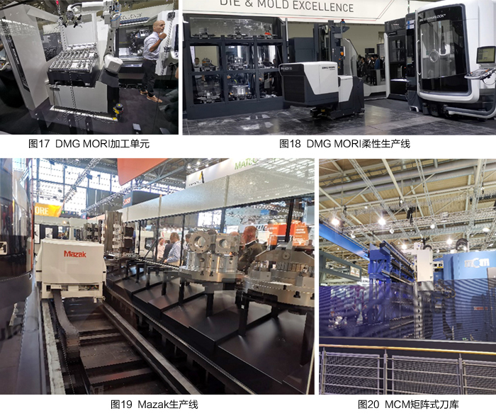 5. 自動化加工單元和生產線成為各大機床廠商推出的亮點。DMG MORI展出的數十臺機床基本都是以自動化加工單元(圖17)的形式展出的,都配有料倉、上下料機械手和造型各異的大容量刀庫,此外DMG MORI還展出了一條由AGV叉車作為搬運單元的柔性線(圖18)。其他廠商如Mazak(圖19)、Doosan、Fill、GROB、SAMAG、Felsomat、MCM等均展示了他們的自動化加工單元或生產線系統,物流系統多采用關節機器人、桁架機械手、RGV叉車或其組合等,定位鎖緊基本都采用零點定位系統,容量巨大的矩陣式刀庫(圖20)應用也比較廣泛。遺憾的是,這些生產線上的機床都是小型加工中心,托盤尺寸規格基本都在800mm×800mm以下,我最想看到的中大型機床組成的生產線沒有得見。