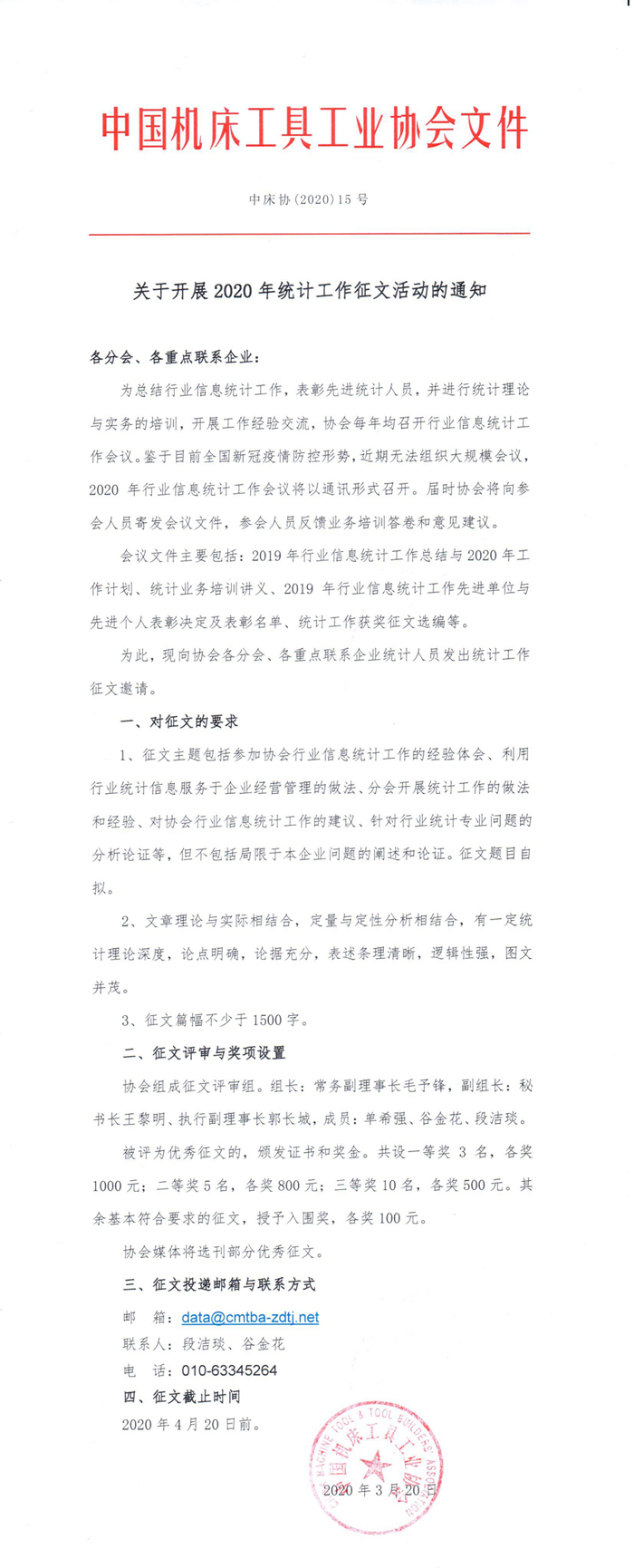 為加強協會信息統計工作,加大統計人員之間的工作經驗分享和交流,在目前因疫情防控需要無法召開相關會議的情況下,中國機床工具工業協會向各分會和重點聯系企業統計人員發出統計工作征文邀請,協會將對征文進行評獎,向獲獎作者頒發證書和獎金。部分優秀征文作品將在協會官方媒體發布。