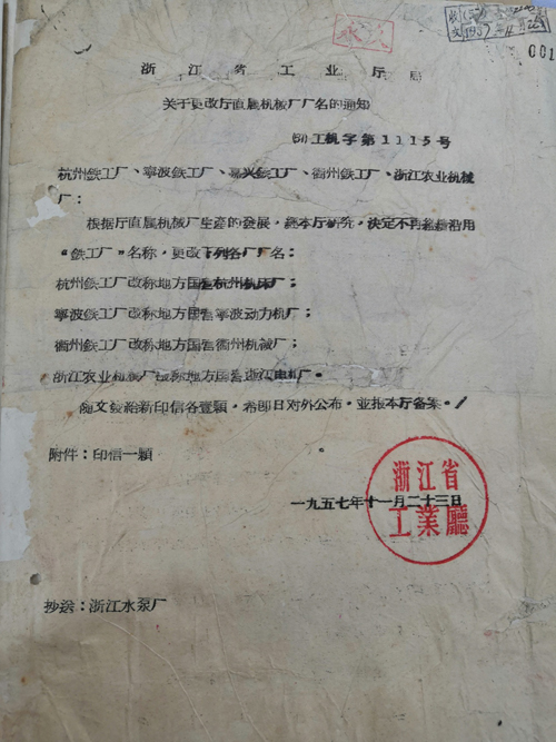 浙江省工業廳關于“杭州鐵工廠”更名“杭州機床廠”的文件