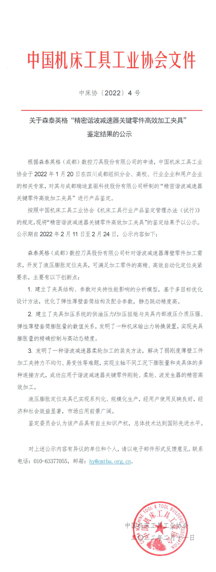 關于森泰英格“精密諧波減速器關鍵零件高效加工夾具”鑒定結果的公示