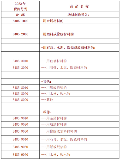 刪除了原列在8477品目下橡塑加工機器中的“三維打印機”,新增“增材制造設備”品目8485,并根據設備所使用的材料以及所加工零件的材料設定了子目。