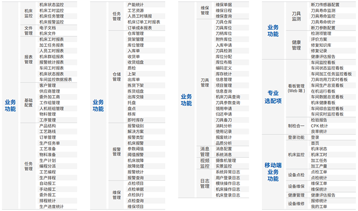 功能模塊:資源文件管理、刀具標準化管理、自動化產(chǎn)線監(jiān)控、設備維保管理等。
