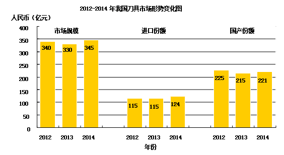 圖1 最近三年國內(nèi)刀具市場規(guī)模及進(jìn)口、國產(chǎn)刀具所占份額