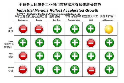 關(guān)于全球制造業(yè)加速發(fā)展的態(tài)勢(shì),美國KENNAMETAL(肯納金屬)公司發(fā)表了一份調(diào)研材料(見圖2)。從圖2可以看出(綠色圓形符號(hào)表示加速增長),除了少數(shù)地區(qū)的部分行業(yè)以外,全球各大洲都呈現(xiàn)出制造業(yè)普遍加速增長的態(tài)勢(shì)。肯納公司的調(diào)研還顯示,東歐、韓國、拉丁美洲、印度、中國等新興市場的需求將會(huì)更快增長。